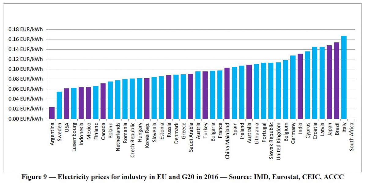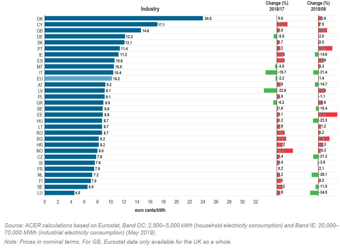 Another example for international comparisons is the following graph from the EU's Agency for the Cooperation of Energy Regulators (ACER) 2019 report. It shows that industry power prices are considerably higher in Denmark, Cyprus and the United Kingdom than in Germany. Also note the different positions of Italy and Denmark compared to the above EU G20 graph.
