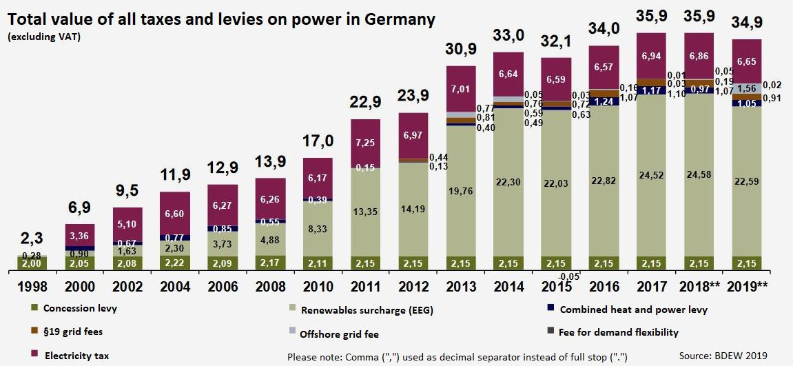 The renewable energy surcharge is the most prominent levy on power prices. It will total around 22.7 billion euros for all consumers in 2019, according to the utility association BDEW. Thereof, industry will pay almost six billion euros, compared to more than eight billion euros shouldered by households.