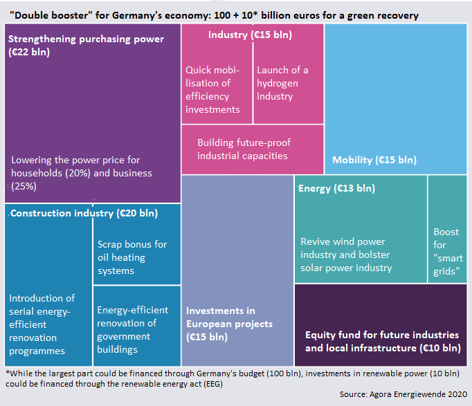Agora Energiewende proposed an investment programme worth 100 billion euros to simultaneously tackle emissions reduction challenges across different sectors and quickly encourage activities in construction, heavy industry and renewable energy production. Environmental group Germanwatch cautioned a stimulus package should be designed jointly by Germany's so-called climate cabinet, a group of ministers responsible for climate-relevant policy areas, rather than by the economy ministry alone.