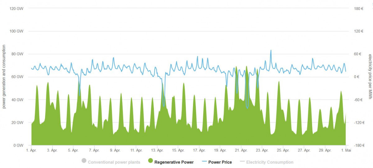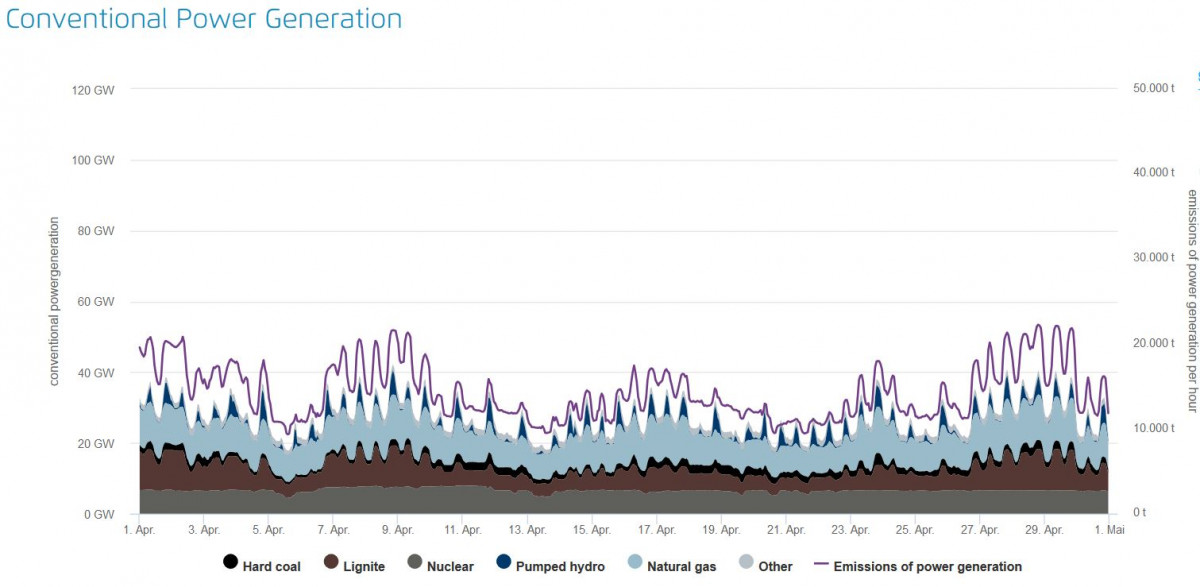 But even at times of peak renewables production and negative power prices, many fossil fuel power plants did not stop power production in April. The following graph shows conventional power generation running uninterruptedly throughout the months.