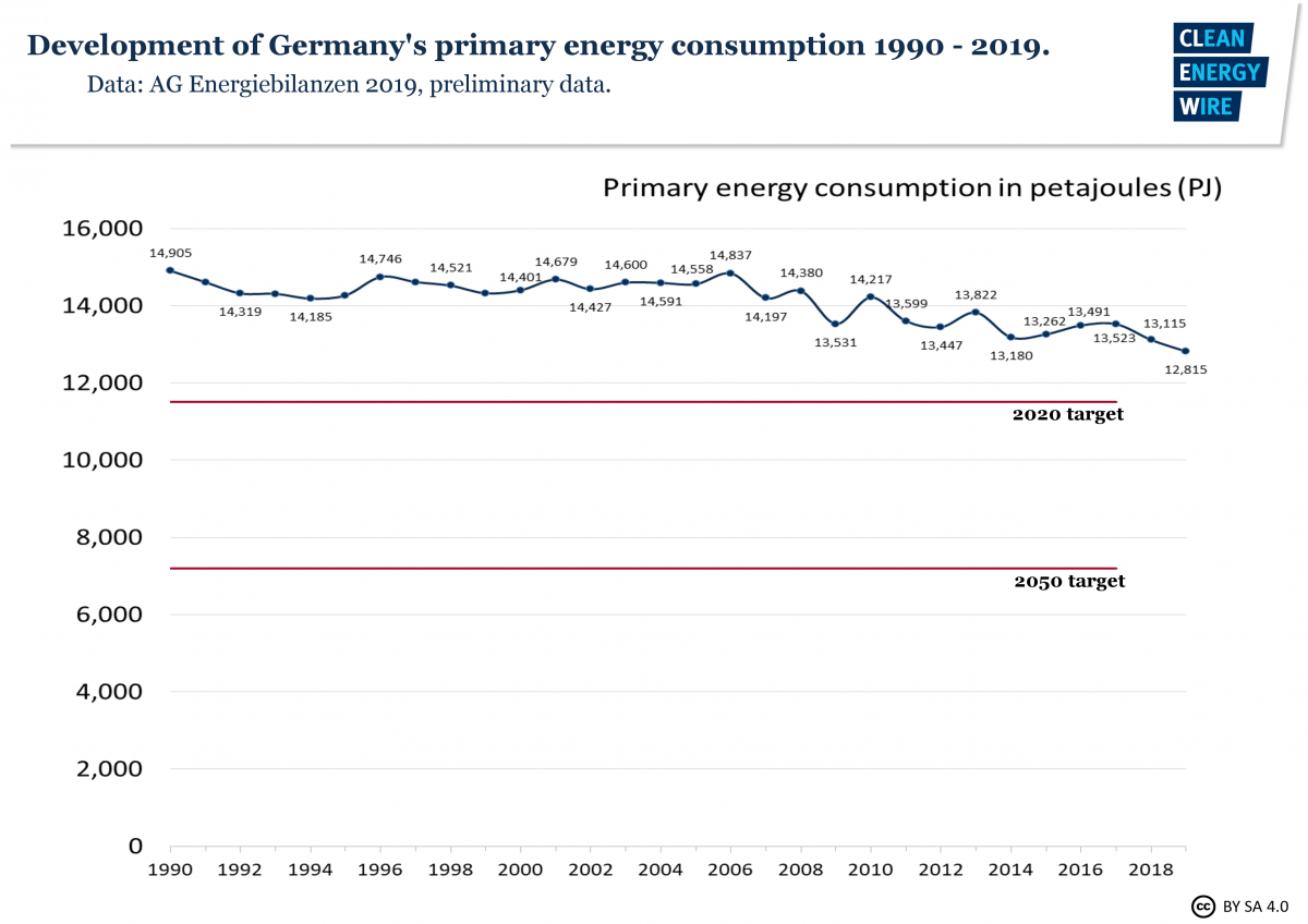 AGEB said that energy consumption would decrease this year to 12,815 petajoule (PJ) from 13,115 PJ in 2018 due to improved energy efficiency and lower demand in energy-intensive industries during the economic slowdown, outweighing adverse effects such as cooler weather and population growth. Germany is still set to miss its goal of reducing energy use by 20 percent by 2020, compared to 2008 (-11% in 2019), however.