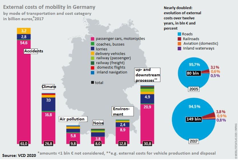 The external costs caused by traffic and other mobility activities in Germany are in the range of 149 billion euros per year, transport NGO Verkehrsclub Deutschland (VCD) has stated in a factsheet. External costs are those outside of the direct costs involved when purchasing a car, gasoline, or paying vehicle tax. They include expenses that are typically not paid for by the person responsible but by society as a whole. 95 percent of Germany's external mobility costs are caused by lorry and passenger car road traffic, whereas railroad traffic accounts for less than four percent and domestic aviation to less than one percent, the VCD says. With nearly 13 cents per kilometre, however, aviation has the worst cost-distance ratio, compared to four cents for bus or train travel. According to the VCD, external mobility costs in the country nearly doubled between 2005 and 2017 and are mostly linked to accidents, climate effects and production and disposal of vehicles.