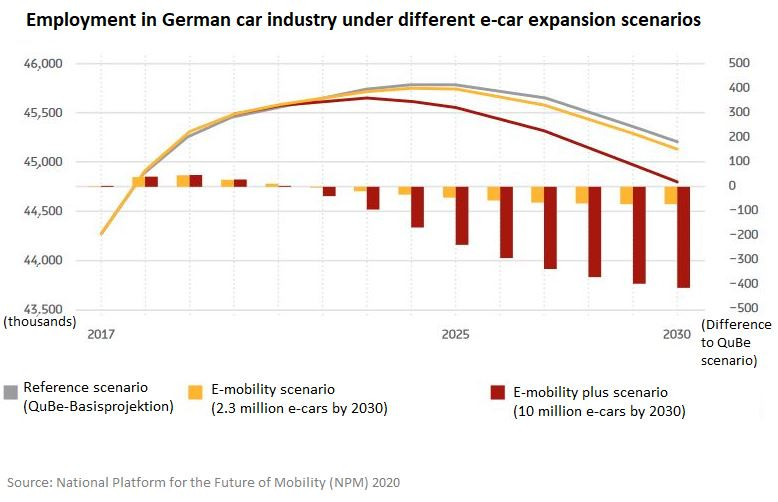 The self-reliance of Germany's carmakers for producing electric vehicles has to increase substantially over the next years if massive job losses in one of the country's most important industries are to be avoided, government advisers of the National Platform on Future Mobility (NPM) say in a new report. "If the competitiveness of Germany's industry regarding e-mobility does not improve in the next years and the need for import for battery cells and e-cars grows in line with the roll-out, effects on the employment structure would be significant," the NPM concludes in its report. Under the most pessimistic scenario, there could be up to 410,000 fewer jobs by 2030, about 0.9 percent of all jobs in the country, the NPM says. The advisors add that the country's car producers will no longer be able to create wealth and employment along the entire production chain as they do today; production of e-cars can be automated much better than that of combustion engine cars. Investing continuously in training and identifying new potentials for value creation through changed business models are necessary for carmakers to retain jobs. "We can already see today that not only the number of jobs in the mobility sector will change but also the quality of jobs," said Jörg Hofmann, chairman of the IG Metall labour union and leader of one of the NPM's working groups. The NPM says companies should not deal with the transition alone and call for joint "competence hubs" of different companies in cooperation with government agencies to coordinate further education programmes and adjust them to local needs.