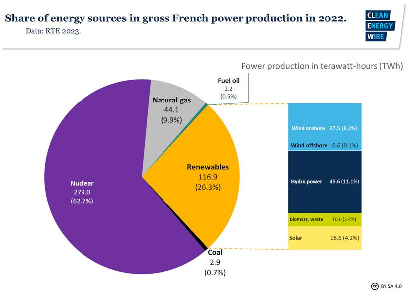 In France, the primary energy mix was composed mainly of nuclear power (40%) Primary production of renewable energies in 2022 in France amounted to 345 TWh, the ministry said, including biomass (38%), hydropower (17%), heat pumps (12%), wind power (11%) and biofuels (6%). Fossil fuels accounted for 46 percent of primary production, mainly with oil (28%) as well, followed by gas (15%) and a marginal share of coal (3%).