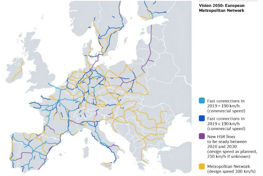 To meet the EU’s goal of shifting millions of passengers to rail in order to reduce transport emissions, the continent’s high-speed track network should be expanded from 11,000 kilometers today to 32,000 kilometers by 2050, according to a report published by German operator Deutsche Bahn with other European railways. The companies proposed a “Metropolitan Network” to connect all of the EU’s 230 metropolitan regions and large cities to regular high speed passenger trains, aiming to more than triple high speed rail traffic. Around 60 percent of Europeans live in these metropolitan regions. This expansion of the highspeed rail network would help achieve the EU’s goal of reducing transport-related carbon emissions by 90 percent by 2050, the report says. Germany, Poland, Romania, France and Spain would see the largest expansion of high-speed rail, with Germany’s high speed track length almost tripling to over 6000km if the proposal is implemented.