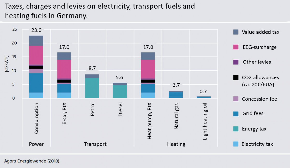 Another way of pricing carbon in the transport and heating sectors would be to adjust existing taxes and levies on energy products according to their CO2 intensity. This would make fossil fuels like heating oil – which is very cheap in Germany, compared to other European countries – more expensive, while lowering electricity prices, a recent report by think tank Agora Energiewende* suggests.