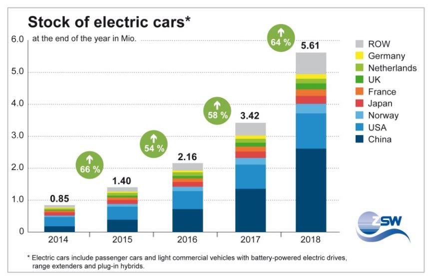 The number of electric cars worldwide rose 64 percent last year to reach 5.6 million in early 2019, according to the Centre for Solar Energy and Hydrogen Research Baden-Württemberg (ZSW). “China remains the undisputed global leader with a total of 2.6 million e-cars. It is followed by the USA with 1.1 million e-cars. Just short of 142,000 electric vehicles are now rolling on Germany’s roads,” the researchers report in a press release (in English). “Tesla accounts for the largest number of newly registered vehicles, nearly 234,000, followed by the Chinese brands BYD and BAIC. The most successful German manufacturer was BMW, taking sixth place with close to 87,000 electric cars, followed by VW in ninth place.”