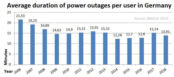 The German power supply is among the most reliable worldwide and the average outage time has continuously fallen in recent years as the expansion of wind and solar power sources progressed, despite a spike in 2017. Apart from extreme weather events, price speculation on the power market was in 2019 suspected to cause strains on the grid. The recent introduction of a new system on the market for control reserve should however prevent this possible source of fluctuations in the future.