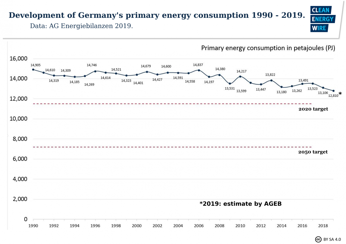 Germany aims to reduce primary energy consumption by 20 percent by 2020 (compared to 2008 levels). AGEB’s estimate would only mean a reduction of about 11 percent by 2019.