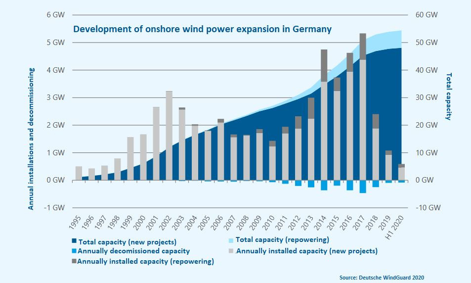 The share of wind power in Germany's electricity system climbed to unprecedented levels in the first half of 2020 and contributed substantially to renewables covering more than half of the country's power demand, as wind and sunshine were available in abundance and demand plummeted due to the coronavirus lockdown. However, despite its strong output, onshore wind power is struggling to regain the expansion vigour it had before 2017, when the process was changed from fixed guaranteed remuneration for new projects to tenders in which bidders vie for the lowest level of support. Onshore wind power is by far the most important renewable energy source in the country and is expected to play a key role in Germany's future emissions reduction scenarios.