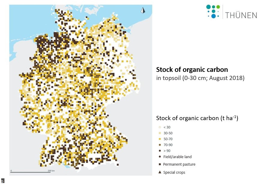 Another land-based option is using the ability of soils to store carbon through “carbon farming”. Reduced ploughing (low-till or no-till practices), planting perennial crops, cover crops and other methods, can help with humus build-up on fields, i.e. providing soil carbon sequestration. A 2018 comprehensive study of Germany’s soils’ organic carbon content came to the conclusion that a total of 2.5 billion tonnes of carbon is stored there in the form of humus, 1.3 billion t in fields and 1.2 billion t under grassland. However, projections also showed that these soils at the moment stand to lose carbon instead of taking up more, if not farmed with sequestration in mind.