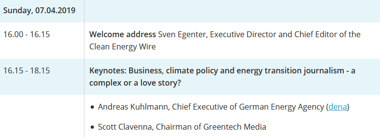 Andreas Kuhlmann, head of the German energy agency, dena, and Scott Clavenna, co-founder and chairman of Greentech Media, will kick-off #GETJO19 with first-hand insights from shaping the energy transition and keeping a close eye on the companies involved. Their keynotes will set the scene for two days of discussions and lively debate with some 100 journalists and a growing list of first-rate expert speakers from media, business, NGOs and science. For the grand finale, Sparknews founder Christian de Boisredon will tackle how solutions-oriented journalism can make a difference, and present impressive examples of the international media cooperation his initiative has triggered. [Click for full programme and list of speakers. Sign up.]