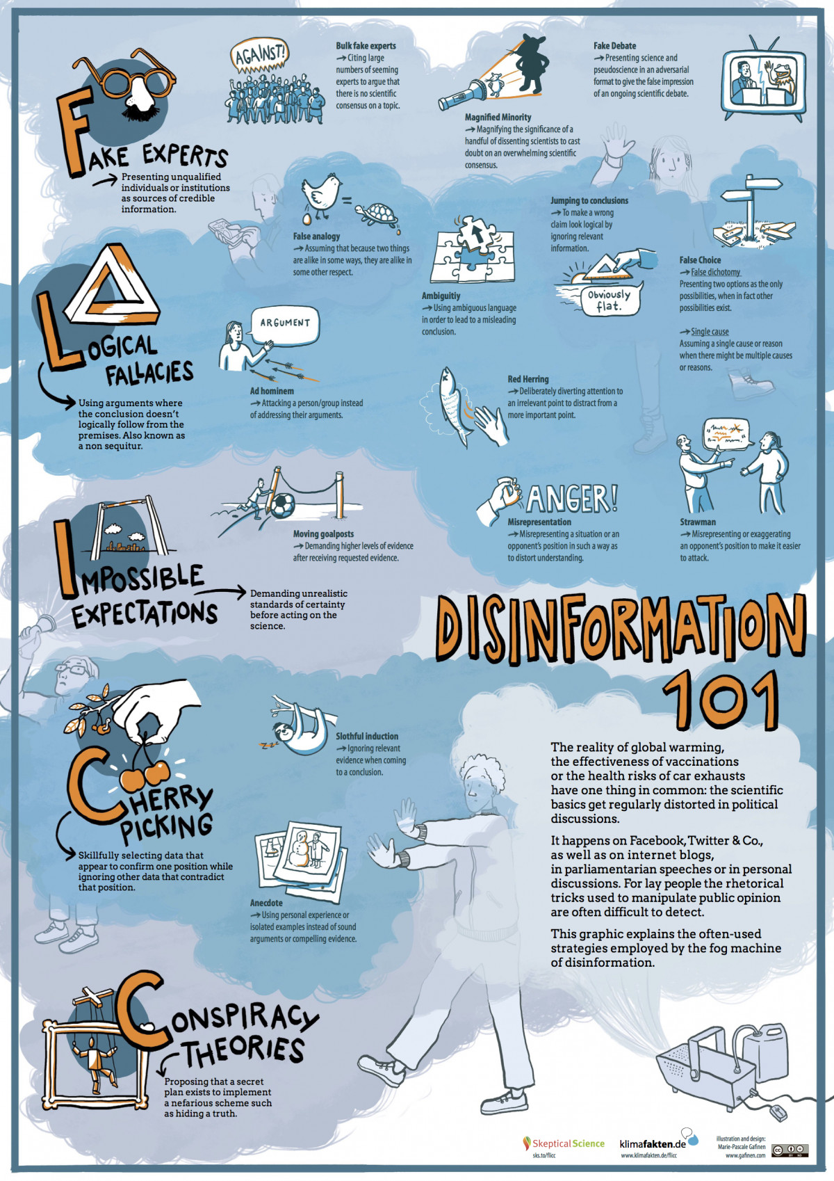 The infographic was developed together with the international team of skepticalscience.com, the award-winning website debunking false claims on climate science, and Hamburg-based illustrator Marie-Pascale Gafinen. It is available online in English and German (where the acronym of the core tactics is P-L-U-R-V). More versions of the acronym may become available in different languages as well. In addition to the electronic version, the graphic can be ordered as a printed poster in A2 format via Klimafakten.de (while stocks last).