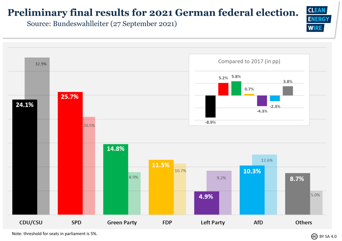 Germany is heading towards a three-party federal government with a significant climate action focus as the Social Democrats appeared to score a thin victory in the federal elections following an unexpected comeback, and the long-ruling conservatives slumped to their worst result ever. The country may not know the successor to chancellor Angela Merkel for weeks if not months as the leaders of both parties vowed to talk to the Green party, which recorded its best result ever, and pro-business Free Democrats to form the country's first three-party government. In first reactions all leading candidates stressed that climate action has to be at the core of any new coalition. Read the article here.