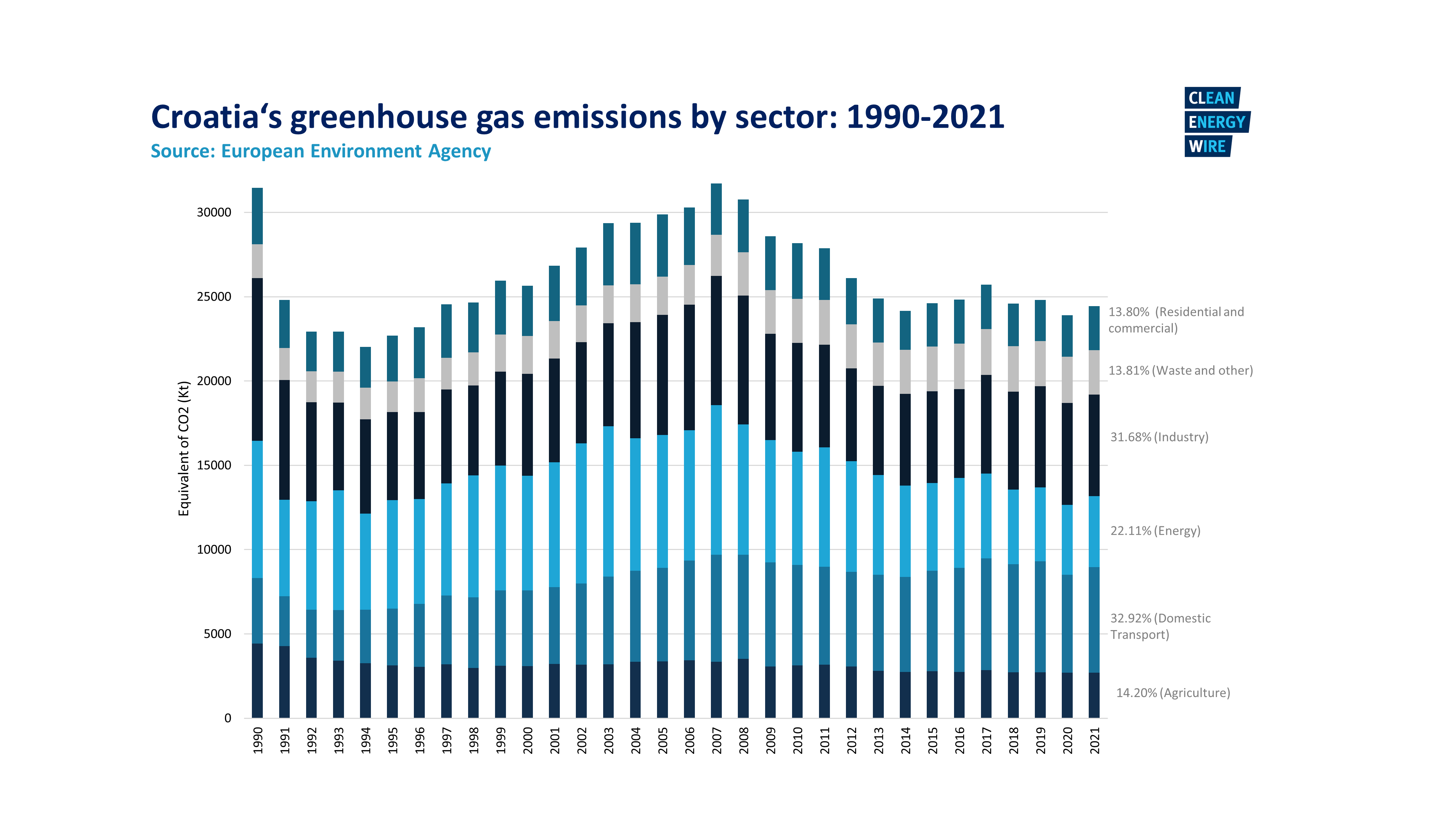 - In 2021, approximated domestic greenhouse gas (GHG) emissions in Croatia were 23.3 MtCO2-eq, 2.1 percent lower compared to 2020 and 5.6 percent below pre-pandemic levels. Overall, net domestic emissions, including the land use, land use change and forestry (LULUCF) sector, were 41.9 percent lower than in 1990.