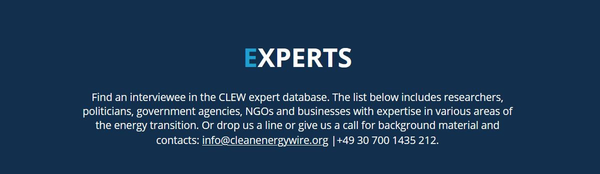 Last but not least, you can always get in touch with the team at Clean Energy Wire (info@cleanenergywire.org). We will provide information and connect you with the experts you are looking for.