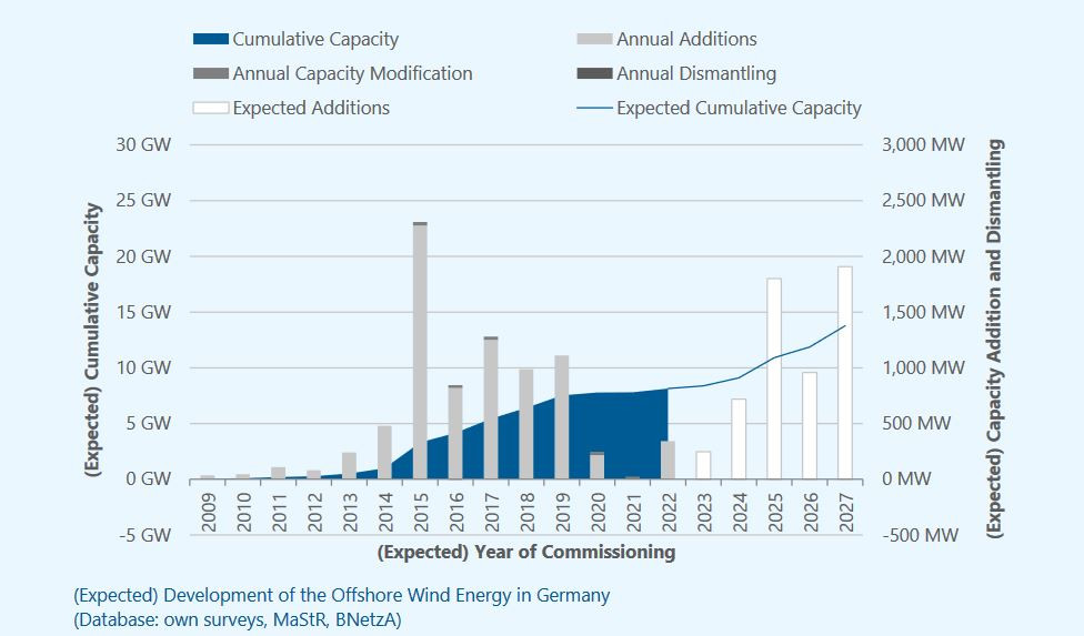 The first offshore wind farm in Germany came into operation in 2010, making it the most recent major renewable energy technology to enter the country’s electricity generation mix. In the years following its roll-out, offshore wind power saw a rapid growth in Germany and other countries around the North Sea and the Baltic Sea. At the end of 2022, more than 1,500 turbines with a cumulative capacity of roughly 8 gigawatts (GW) operated in German waters. Thanks to the turbines’ reliable performance and fast cost reduction, the first projects that no longer needed state support were announced by investors in 2017, raising hopes that the technology can become a pillar of the country’s energy transition.