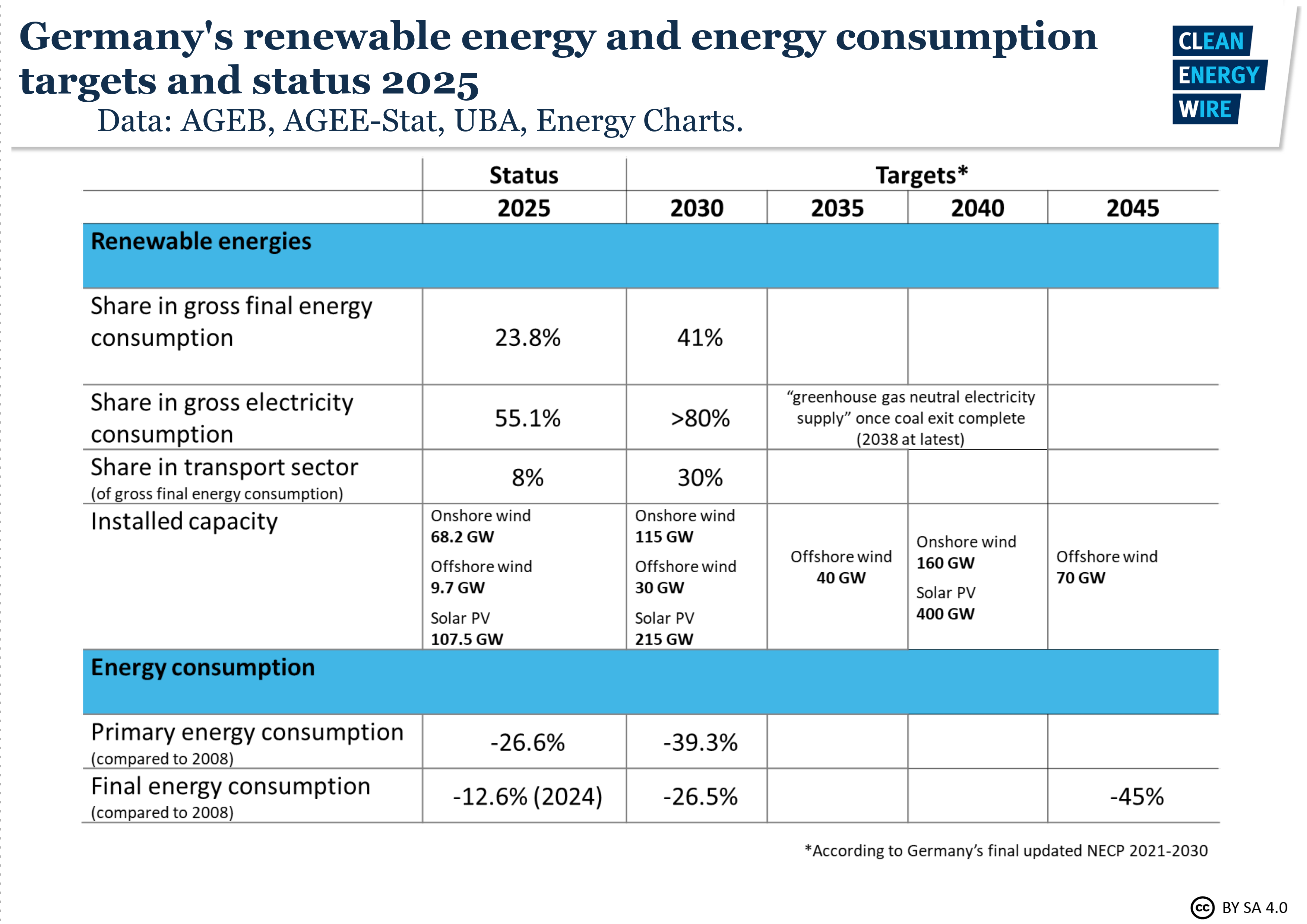 Germany's National Energy and Climate Plan (NECP) – a plan each EU member state must submit – lays out Germany's energy transition targets (chapter 1.1.iii.).