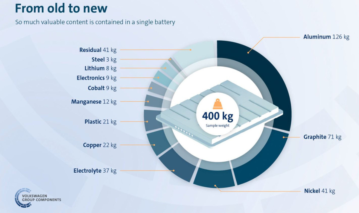 Europe's largest motoring association ADAC said the average battery of an electric car on the road in Germany as of 2019 weighed about 400 kilograms and had a capacity of about 50 kilowatt hours. Most of the weight comes from the reinforced casing needed to protect car batteries against accidents. Aluminium, steel and plastics therefore make up the bulk of components. But the average battery also held six kg of lithium, 10 kg manganese, 11 kg cobalt, 32 kg nickel and 100 kg of graphite, the most relevant materials when it comes to recycling (figures may vary for batteries from individual carmakers).