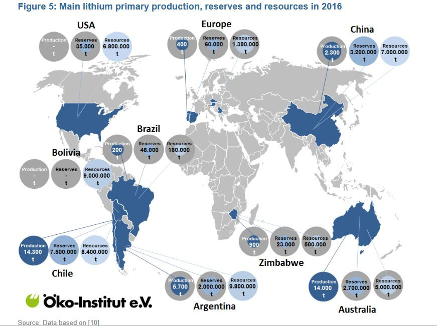 Proven lithium reserves are already four times larger than they were in 2008. If the entire potential of identified resources is included, about 80,000 million tonnes of lithium are available, according to Öko-Institut. Germany's resource agency DERA thus placed lithium in the "medium risk" range in its 2019 critical raw materials index. Despite the current geographic concentration of supply, "good governance" in sourcing countries is likely to guarantee stable supply, it said.