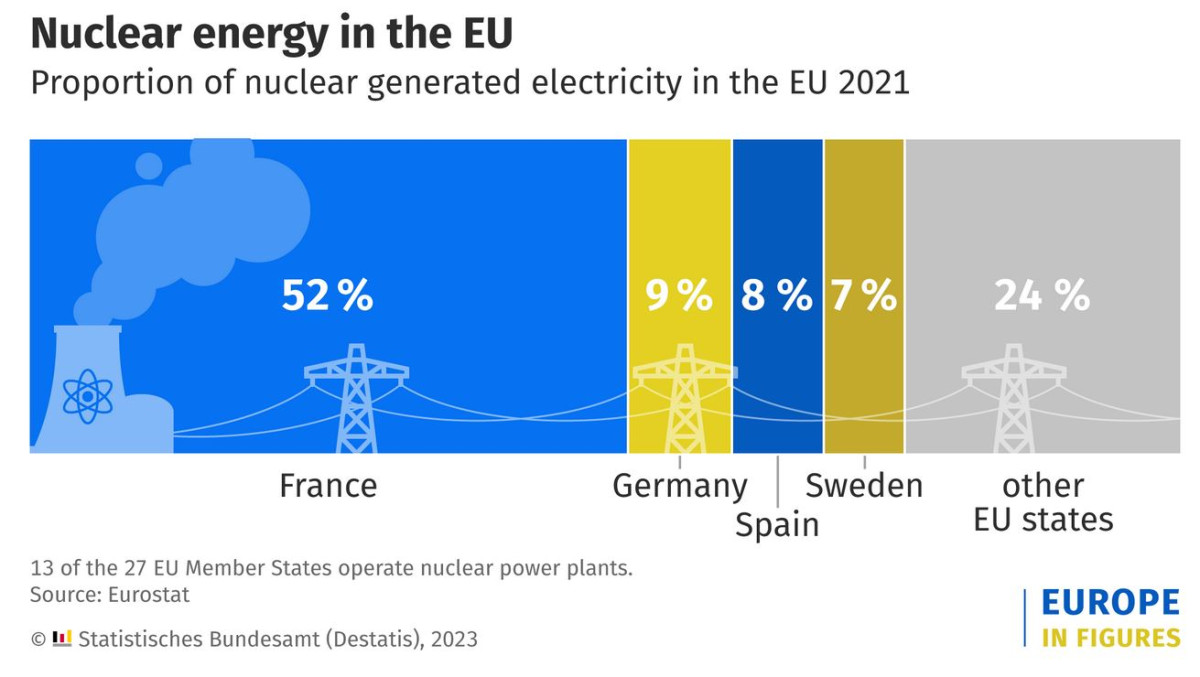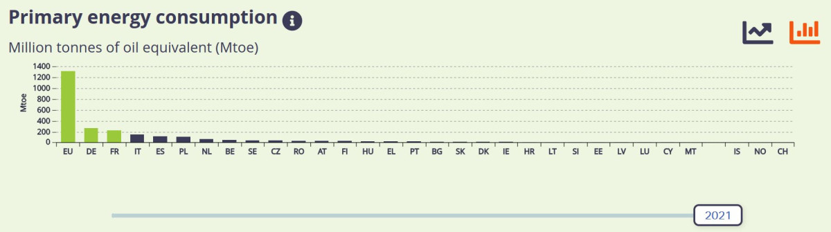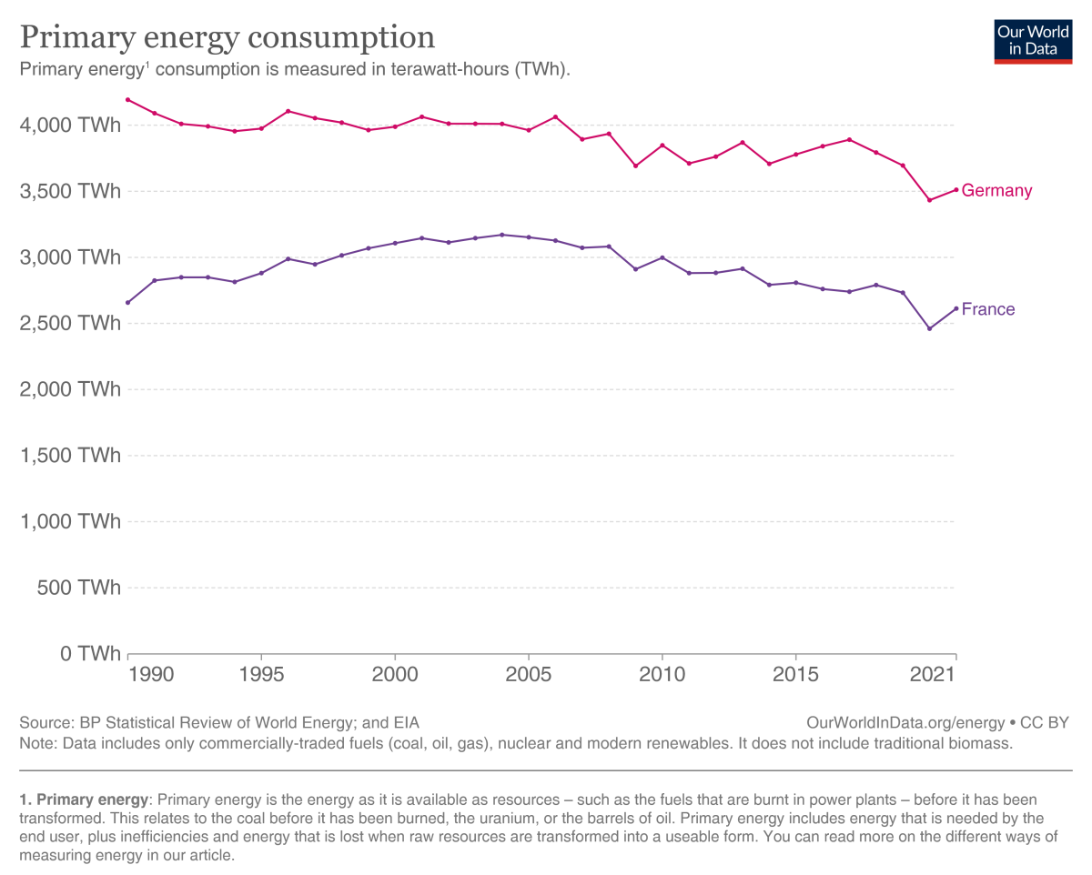 Together, the two countries accounted for roughly 38 percent of total EU energy consumption in 2021. Of the roughly 1,300 million tons of oil equivalent used in the EU in 2021, Germany consumed 267 million tons and France some 224 million tons.