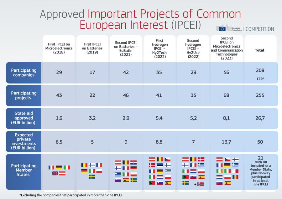 As of early 2023, several research and development projects as well as first industrial deployment projects for the joint production of batteries and hydrogen have received approval by the EU Commission. The 27-billion-euros of state funding for six approved IPCEIs are hoped to unlock a wave of additional private investments that would raise the tally up to some 80 billion euros.
