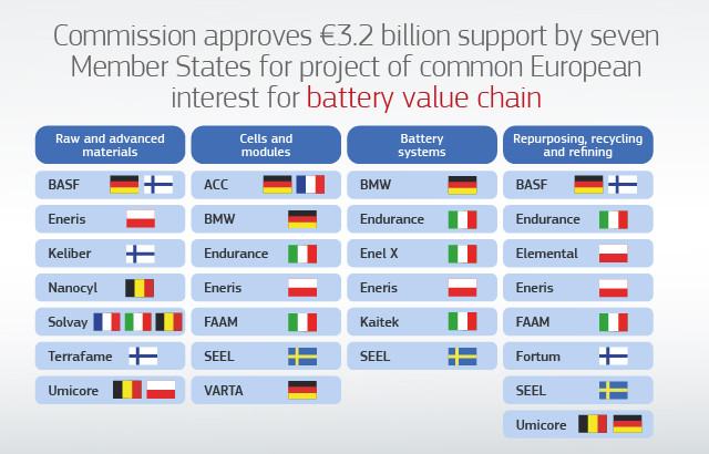 The first IPCEI battery project was launched in 2019, with completion planned for 2031. It involves 17 companies from seven countries (France, Germany, Belgium, Finland, Italy, Poland and Sweden) and mostly industrial actors, including small and medium-sized enterprises (SMEs). The project also involves over 70 external partners, including public research organisations from across Europe. Member states were to provide up to 3.2 billion euros in funding in the following years to unlock an additional 5 billion euros in private investments.