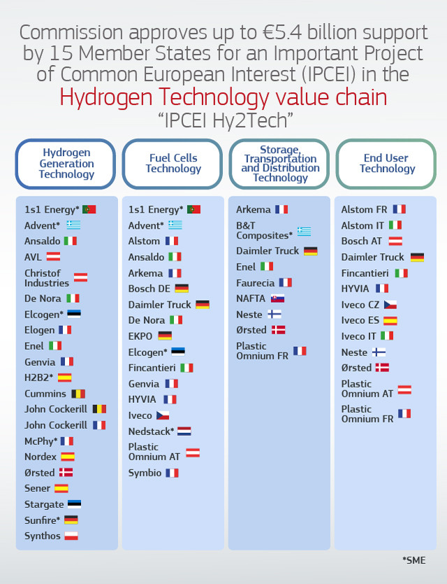 IPCEIs again have a role to play in this shift, supporting investment and innovation. A first project, the IPCEI Hy2Tech, launched in 2022, is intended to develop innovative decarbonisation technologies for the industrial and the mobility sectors. It involves 35 companies and 41 projects from 15 Member States, including France and Germany (along with Austria, Belgium, Czechia, Denmark, Estonia, Finland, Greece, Italy, the Netherlands, Poland, Portugal, Slovakia and Spain). Member states are to provide up to 5.4 billion euros in public funding, which are expected to unlock additional 8.8 billion euros in private investments.