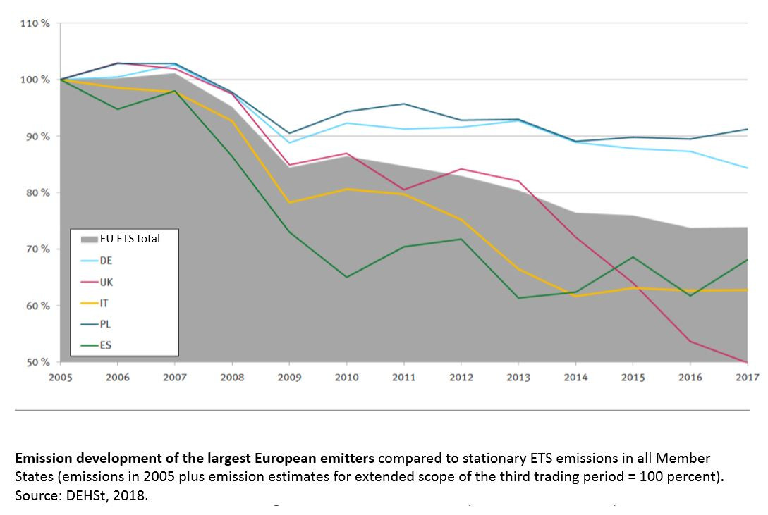 Between 2005 and 2017, emissions in the European ETS sectors fell by 26 percent. Germany, which in 2016 contributed a total of 26 percent to the Union’s ETS emissions, reduced its emissions under the ETS by 15 percent. Almost two-thirds of the country’s ETS emissions come from fossil thermal power stations.