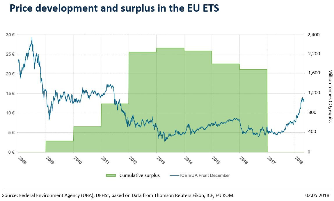 Problems with the ETS include that its caps are not very ambitious, production and emission reductions have occurred due to economic downturns, and international credits have been extensively used. As a result, a large number of surplus emission allowances have accumulated in the EU ETS since 2008 and weakened the instrument, argue the European Commission and Germany’s Federal Environment Agency (UBA), which runs the country’s official Emissions Trading Authority (DEHSt). “These surpluses have contributed significantly to the fall in EUA prices between 2011 and 2017,” UBA says. In those years, prices were as low as 3 euros and never exceeded 10 euros per EUA (see graph below).