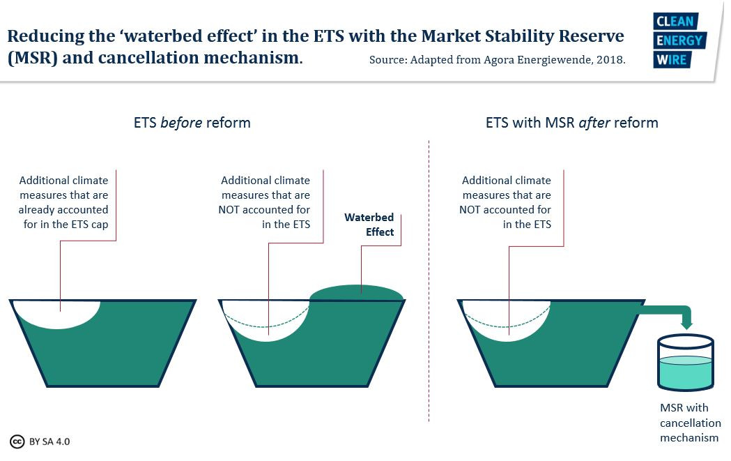 Most researchers agree that after the 2017 ETS reform for the fourth trading period establishing the Market Stability Reserve and the automatic cancellation mechanism, the ‘waterbed effect’ will be more or less diminished in the future. If more allowances are freed up by national climate action in the ETS sectors, more EUAs will be transferred to the MSR, and as of 2023, more of these will be cancelled automatically from the reserve – the overall cap in the ETS is thus dynamically adapted to a higher-than-normal fall in emissions (see Reforms to give the ETS teeth).