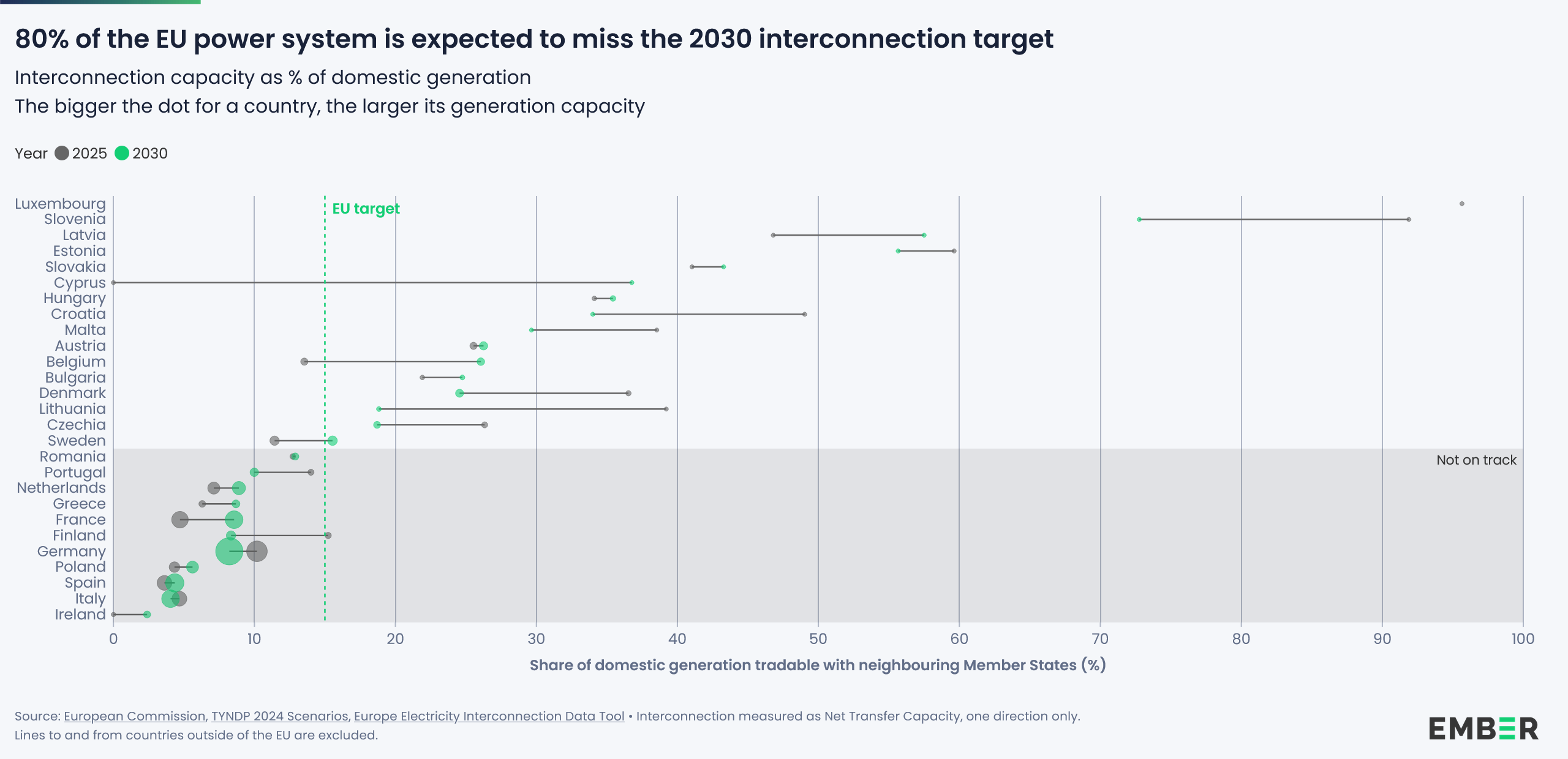 - Getting back on track to meet interconnection targets: Around 80 percent of the EU power system is expected to miss the 2030 interconnection target, which requires countries to have an electricity import capacity equivalent to 15 percent of installed generation capacity, up from ten percent in 2020. “The countries that would benefit most from interconnection are also those expected to have some of the lowest scores by 2030,” a report by think tank Ember concluded.