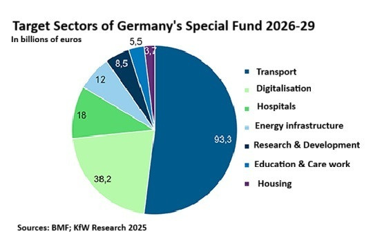Between 2026 and 2029, the government intends to allocate nearly 60 billion euros per year via the special fund, an overview by state-owned development bank KfW showed. The federal government receives almost 40 billion euros, the CTF 10 billion euros and another 8 billion euros go to the states, which are supposed to pass them on to municipalities for investment purposes. In total, this amounts to 179 billion euros in expenses until 2029, of which more than half (€93 bln) go into transport infrastructure investments. However, this is also the sector for which the 2026 core budget is cut the most, KfW said.