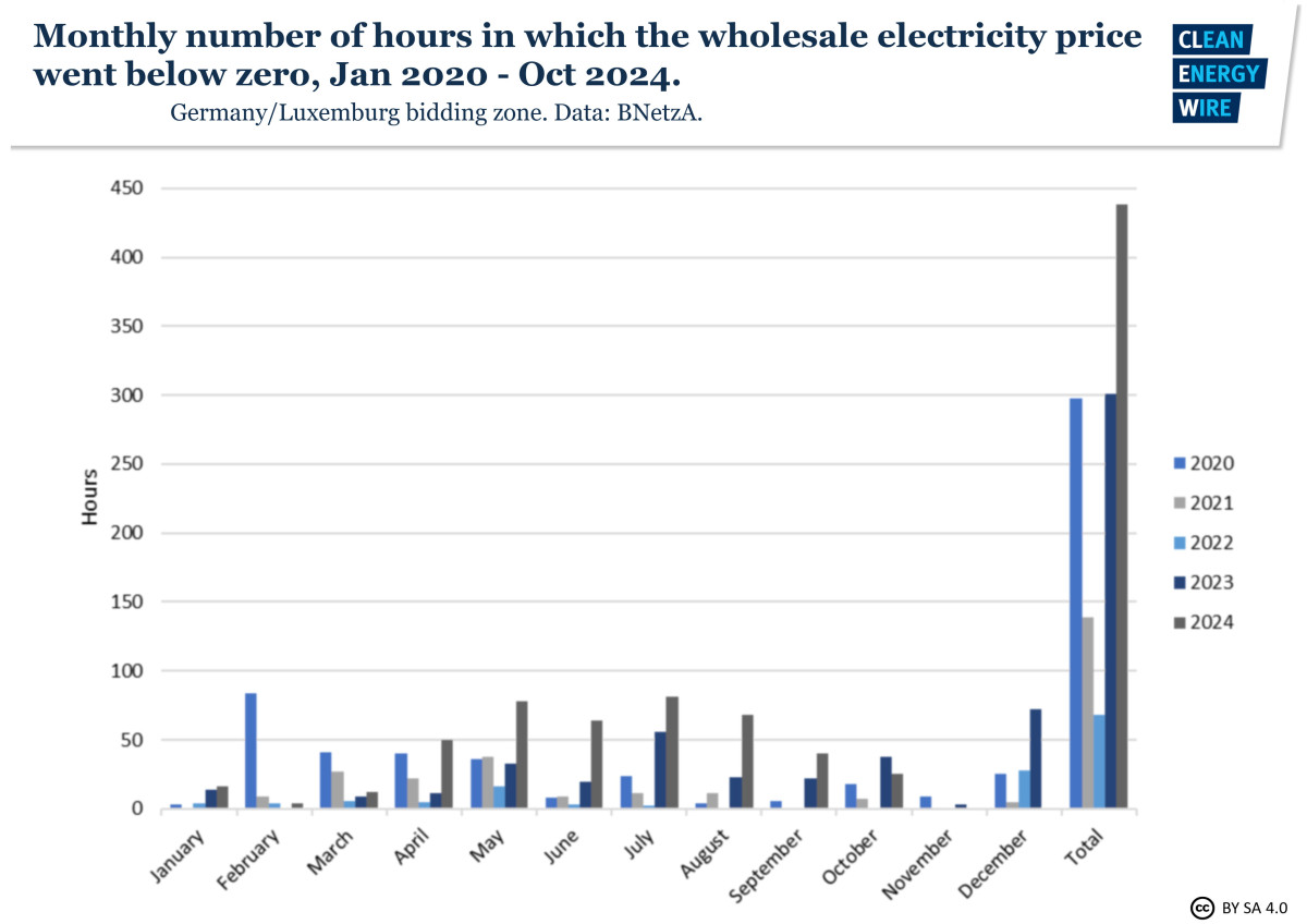 Renewable energy covered over half of Germany's gross electricity consumption in 2023. The same year, installed renewable power capacity increased by about 17 gigawatts (GW) to a total of 166 GW. All the while, the number of hours with negative power prices is also on the rise at times of oversupply due to favourable conditions for wind and solar. When this happens, power plant operators pay consumers to use electricity, instead of getting paid to produce it. Between January and October 2024, Germany saw over 430 hours with negative wholesale electricity prices.