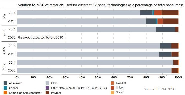 Solar PV modules consist of multiple solar cells that are protected by glass and plate covered by a waterproof and translucent layer usually made of plastic. The plate is encased in a metal frame, often aluminium. Glass, metal and plastic account for up to 90 percent of the module's weight. Most panels also contain copper and small amounts of silver in metallisation pastes. But the biggest difference in component materials is determined by the cell technology used.