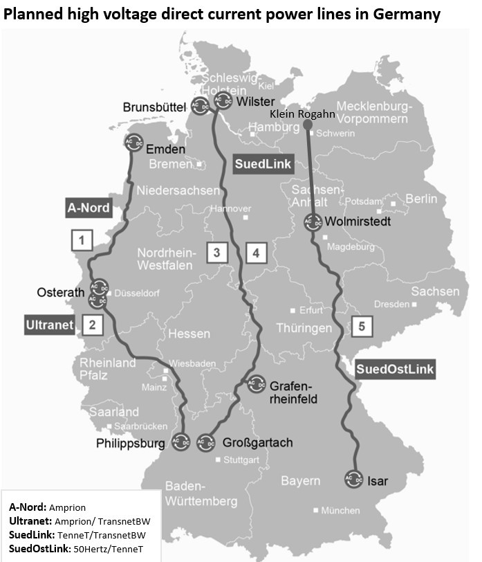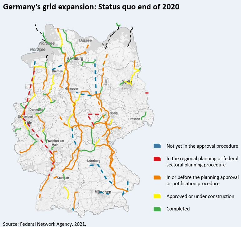 The two pieces of legislation that guide the grid expansion in Germany are the Bundesbedarfsplan Gesetz (2019) and the 2009 Energieleitungsausbau Gesetz (EnLAG). They require the building of 7,783 km of new maximum voltage transmission lines. This includes the construction of four direct current transmission lines connecting the windy north with the industrial west and south of the country. By the end of 2020, 712 km out of the total 7,783 km had not yet started the planning precudure; 1,185 kilometres were in the regional planning or federal sectoral planning procedure; 3,533 kilometres were before or in the planning approval procedure; 734 km had received planning permission and were being built; and around 1,600 kilometres have been completed.