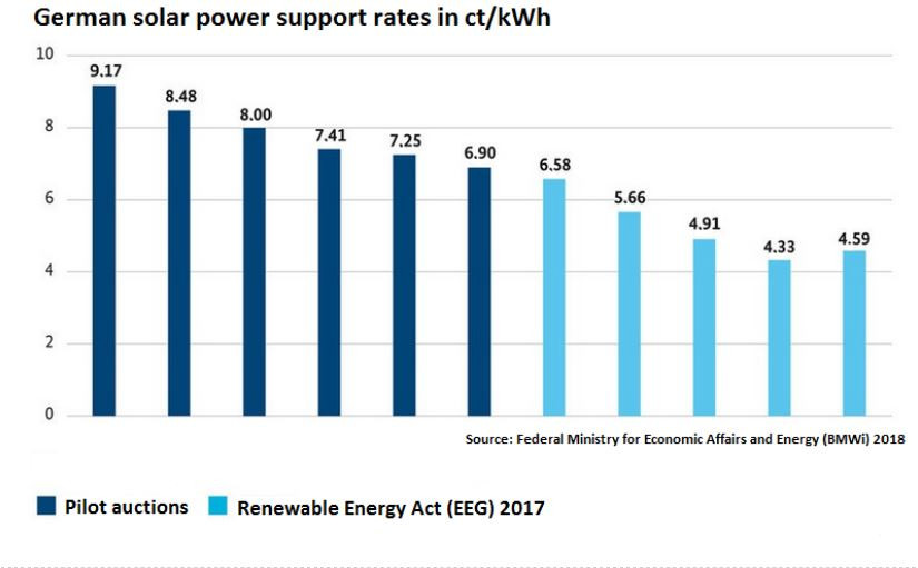 According to research institute Fraunhofer ISE, solar power has become the cheapest mode of power generation also in Germany. Depending on the type of installation and sunshine intensity at a given location, generating one kilowatt hour (kWh) with solar panels may cost no more than 3.7 eurocents, Fraunhofer ISE found. In Germany’s first solar power auction in 2025, successful bids averaged at 4.76 ct/kWh.