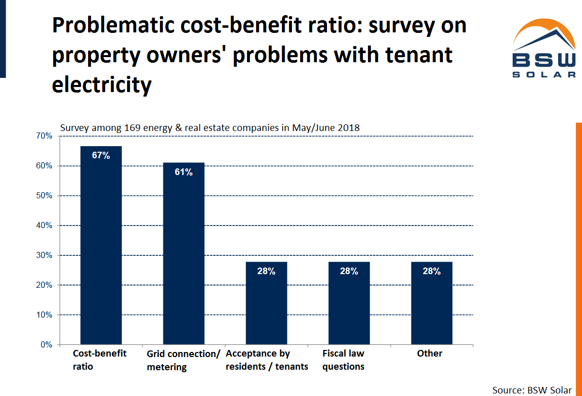 In a survey held one year after the law’s introduction, over two thirds of respondents in Germany’s solar and energy industry said they were not satisfied with the scheme. Reasons for not investing in tenant electricity models were tax burdens on operators, the continued EEG surcharge on directly supplied solar power and the lack of simple metering and billing schemes.