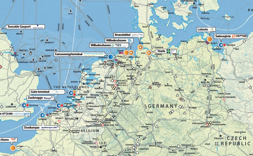 [Gas infrastructure industry association GIE also provides a map on LNG terminals in Europe, last updated in summer 2022. The map provides comprehensive information on existing and under construction LNG Terminals in Europe, including send-out capacity, LNG storage capacity and the main terminal characteristics. Planned or under study LNG terminals projects are also detailed.]