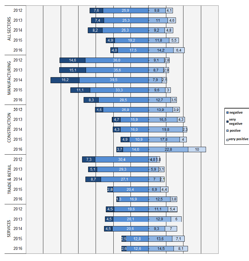 After a notable improvement of the energy transition's perception by German companies in 2016, the DIHK's survey "Energiewende Barometer 2017" revealed that many businesses consider additional power price surcharges the biggest burden in energy policy. However, the Energiewende's overall perception among surveyed companies remained slightly positive in 2017, and even improved by a small margin, the DIHK said. In 2016, companies had evaluated the influence of the energy transition on their competitiveness as generally positive for the first time ever.