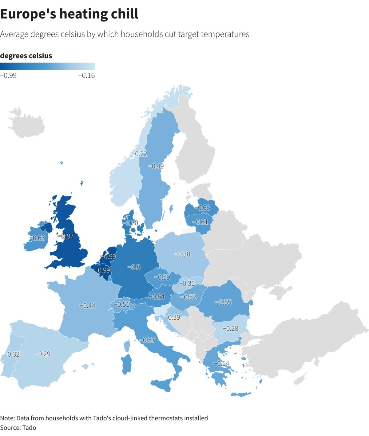 Average heating temperatures dropped across Europe, the company's report based on households using tado°'s smart thermostats and other compatible heating systems showed. Reduction was greatest in the Netherlands, Belgium (both -0.99°C) and the UK (-0.97°C), while households in Norway (-0.22°C), Bulgaria (-0.28°C) and Spain (-0.29°C) lowered average temperatures the least among the surveyed countries. Besides the risk of gas shortages and higher prices, warmer temperatures in the months covered also contributed to lower overall heating demand.