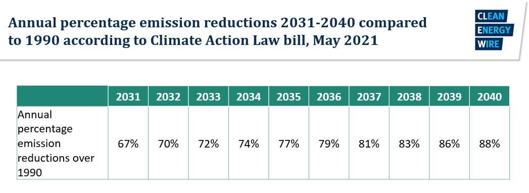 For the time after 2030, the bill introduces annual percentage greenhouse gas reduction targets until 2040, ranging from minus 68 percent in 2031 to minus 88 percent in 2040. The individual sectoral emission budgets for this period are to be set by the government in 2024.