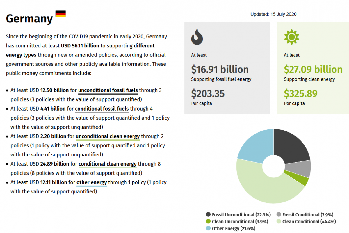 Since the beginning of the COVID19 pandemic in early 2020, Germany has given 48.3 percent of energy related recovery funds to clean energy, a new website tracking the money flowing into the energy sector from recovery packages shows. At least 27 billion USD were allocated to clean energy, with 17 billion USD going to fossil fuel energy, the website energypolicytracker.org which is operated by NGOs IISD, IGES, OCI, ODI, SEI and Columbia University shows. In the G20+ countries,151 billion USD were pledged to fossil fuels, 56% of all public money committed to the energy sector.