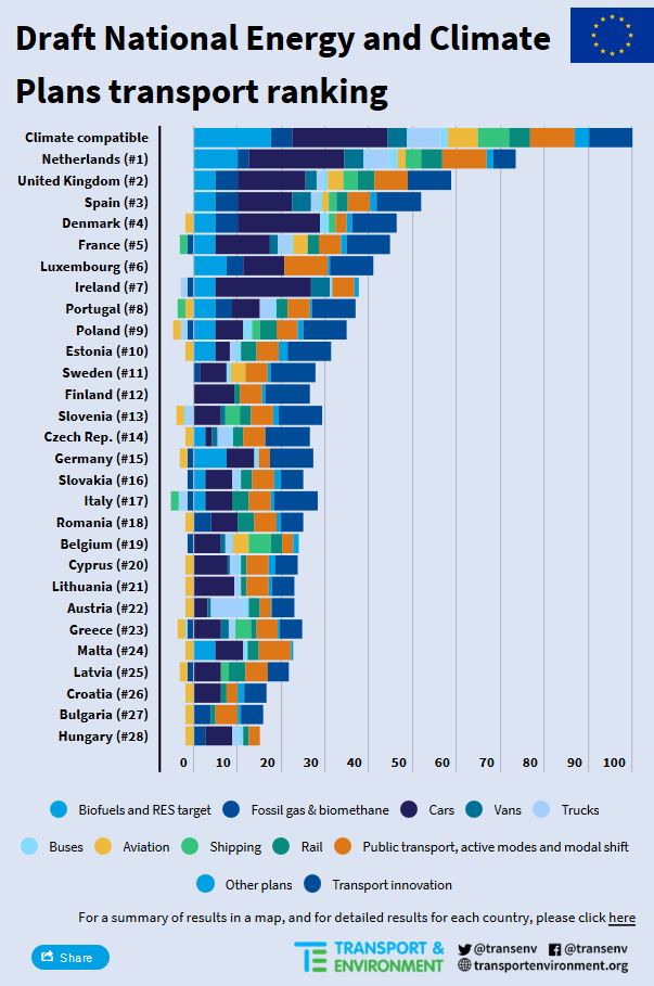 EU governments’ plans to cut pollution from transport will fail to meet their own 2030 emissions targets, according to a ranking by NGO Transport & Environment. Europe’s largest economy, Germany, is among the lower ranked countries (15th), setting itself up to pay billions of euros to other countries for missing emissions goals in the sectors not covered by the European Union Emissions Trading System (ETS). Transport & Environment assessed the transport sections of the countries’ draft National Energy and Climate Plans (NECPs), submitted to the European Commission. The NGO criticised that Germany had left many decisions open in the first draft, which must now be defined for the final version by the end of the year. For example, the draft largely ignores trucks, aviation and the railways sector, according to the ranking.