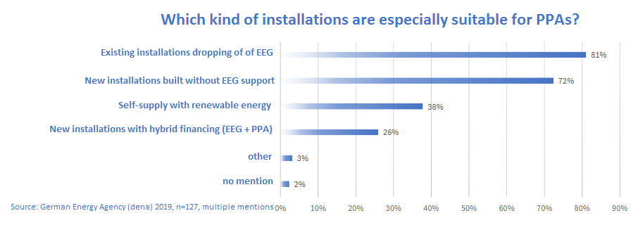 It is this kind of so-called power purchase agreements (PPA), often long-term delivery agreements, that many experts think will become the new default procedure after the feed-in tariff period ends. Under PPAs, the buyer bears the risk of weather-related fluctuations in power supply but therefore only guarantees a limited remuneration per kWh. In a survey by Germany's energy agency dena, over 85 percent of surveyed market representatives said PPAs are "important" or "very important" for the country's renewable energy future. The main reason for this was the prospect of price stability and older installations dropping out of the EEG support scheme were seen as most suitable for this purpose.