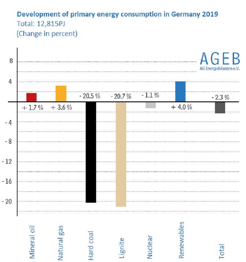 Germany’s primary energy consumption has declined by 2.3 percent in 2019 and a “particularly strong decline” in coal use and rising renewables production has significantly pushed down greenhouse gas emissions for the second year in a row, according to preliminary calculations by energy research group AG Energiebilanzen (AGEB).