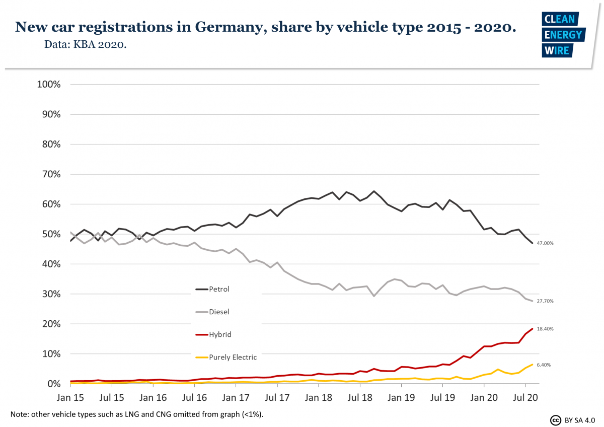 The share of new electric vehicle registrations in Germany reached a new record in August. The number of new purely electric vehicles (BEV) rose 220 percent from last year, to 16,076 vehicles. Their total share is now 6.4 percent, the country's Federal Motor Transport Authority KBA said in a press release. Registrations of hybrid cars rose 130 percent to 46,188 vehicles, resulting in a share of 18.4 percent. Of these, 17,095 cars were plug-ins (PHEV) – an increase of 450 percent to a total share of 6.8 percent. Overall, new car registrations dropped 20 percent to 251,044. Forty-seven percent of these were petrol cars, and around 28 percent had a diesel engine.