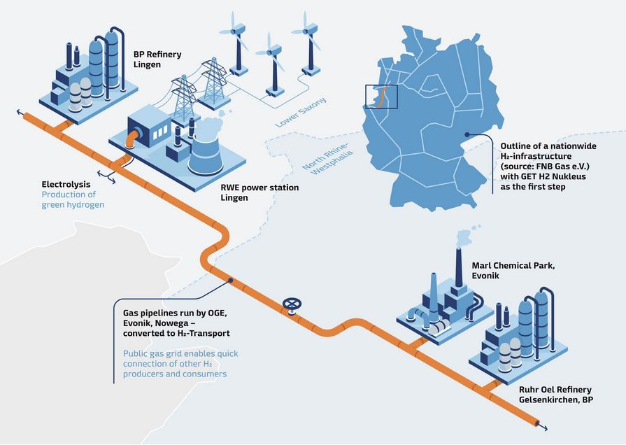 Germany's largest energy company RWE, together with oil company BP, chemicals producer Evonik and gas grid operators have announced the construction of the country's first publicly accessible hydrogen distribution network. The project aims to connect producers of so-called green gas - hydrogen produced with renewable power sources -, with industrial clients from 2022 on, "provided this is economically viable." The hydrogen network dubbed GET H2 with a length of 130 kilometres will be built in the country's northwest to supply industry customers in the states of Lower Saxony and North Rhine-Westphalia and is said to be open for third parties at "transparent prices." An electrolysis plant with a capacity of 100 megawatts in the town of Lingen will provide the hydrogen through a grid that is going to be "converted to 100 percent hydrogen," the companies said. Additionally, existing cavern storages along the hydrogen pipelines shall ensure higher supply security. The project is supposed to "pave the way to technological leadership" for Germany in hydrogen production and facilitate the transition to climate-neutral industrial production in the country, they added.