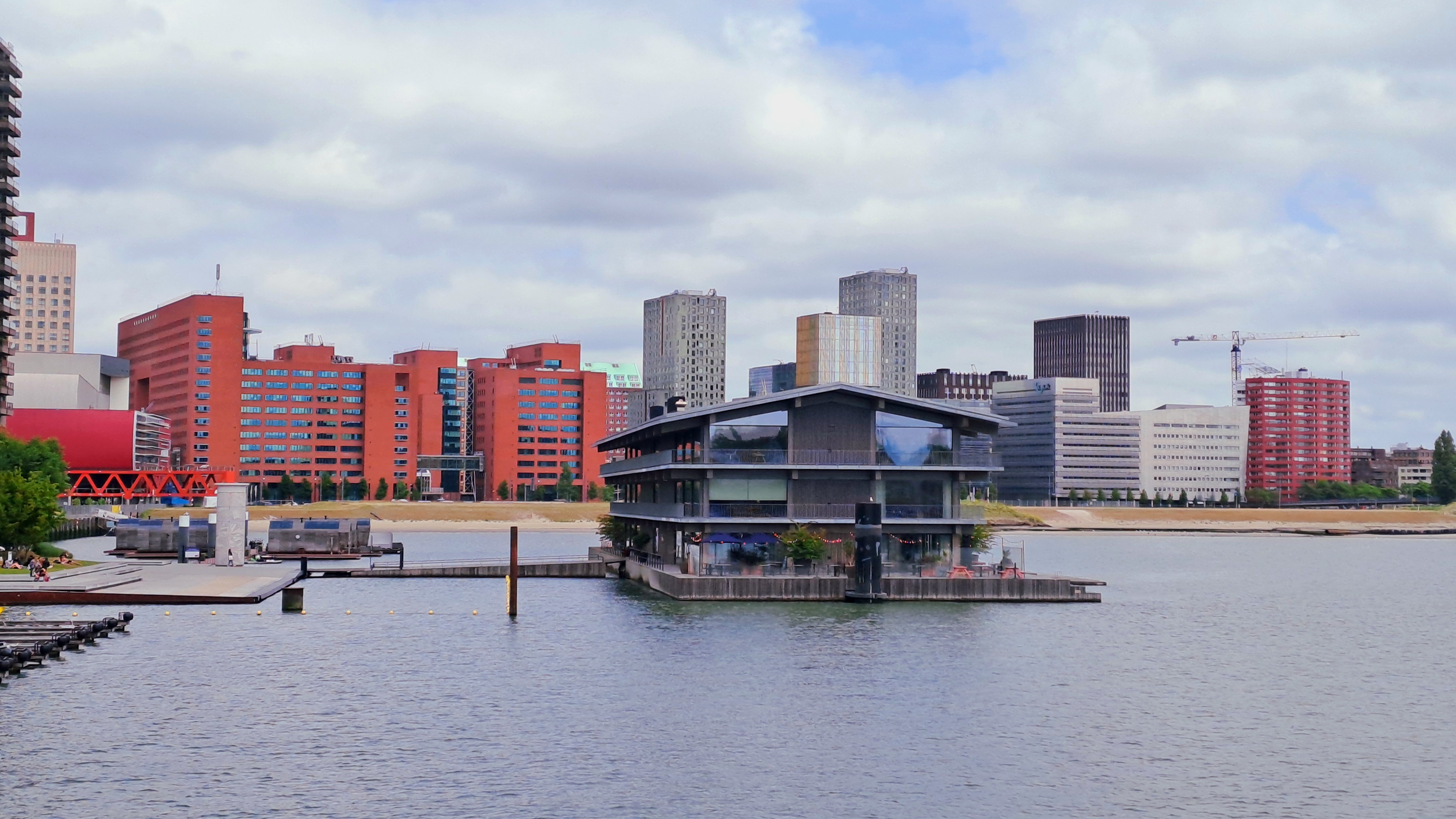 The world's largest floating office imperceptibly rises and falls with the tide in Rotterdam’s Rijnhaven harbour basin, where the Rhine-Meuse delta meets the North Sea. Designed to be largely self-sufficient and “future proof”, it runs on solar power, uses river water for heating and cooling, and has a green roof to absorb rainwater. Built mostly from European timber, it is designed to be dismantled and reused.