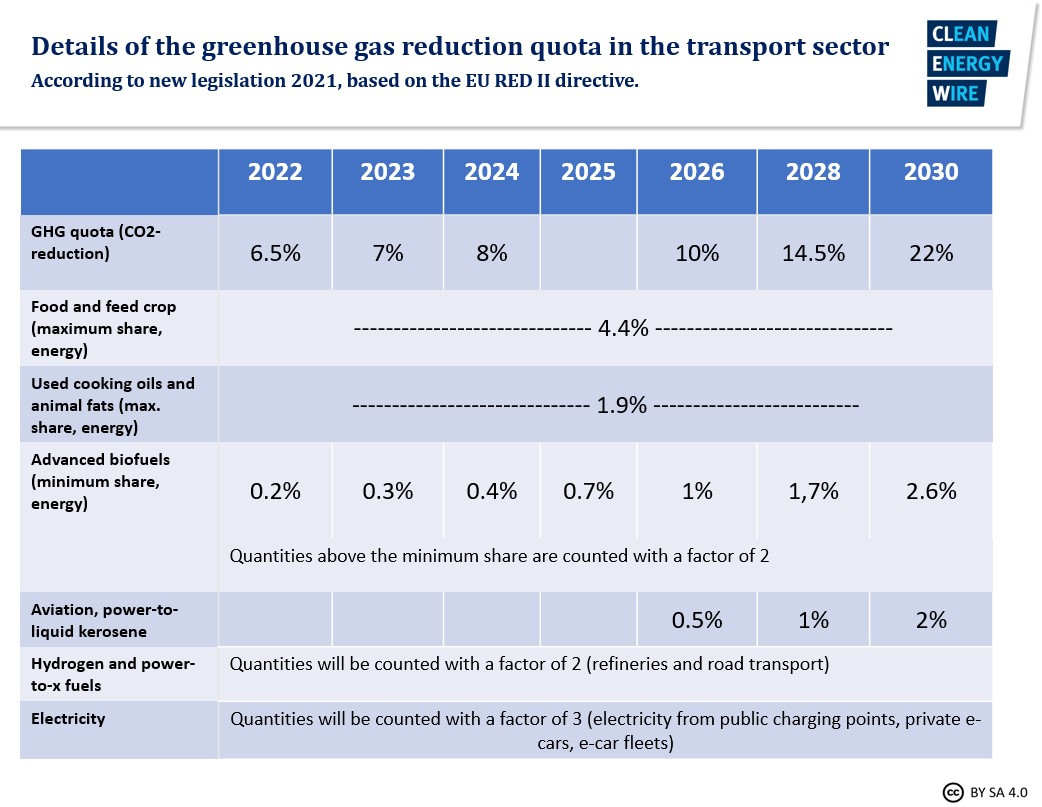 The German greenhouse gas quota legislation is based on the EU’s Renewable Energy Directive (RED II). The draft still needs to be passed by the federal parliament, which is expected to introduce changes before a coalition majority approves the act before the summer break.